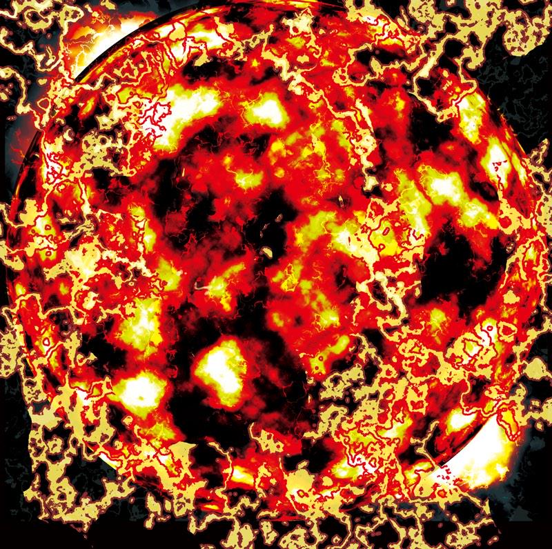 雲模様2を繰り返して新規調整レイヤーのレベル補正→グラデーションマップで白黄赤黒→レベル補正バーで調節→変形球面→ランダムパターンで雷っぽく白黒線引いたらオーバーレイ http://t.co/shdEfJ1Che