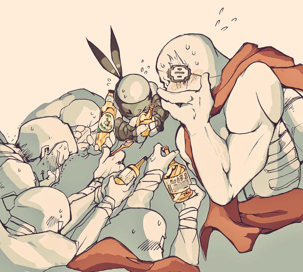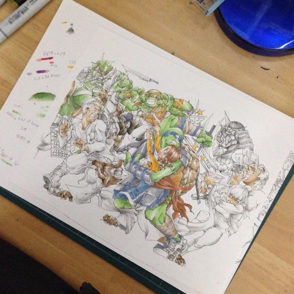 の創作亀Red and blackのファンアート描きました。フット団バレンタイン!(超遅刻)withビール貰ってシュレッダー様がマントの下で尻尾ふってるの想像してるおチョウさん。 http://t.co/hUGX95lIhL